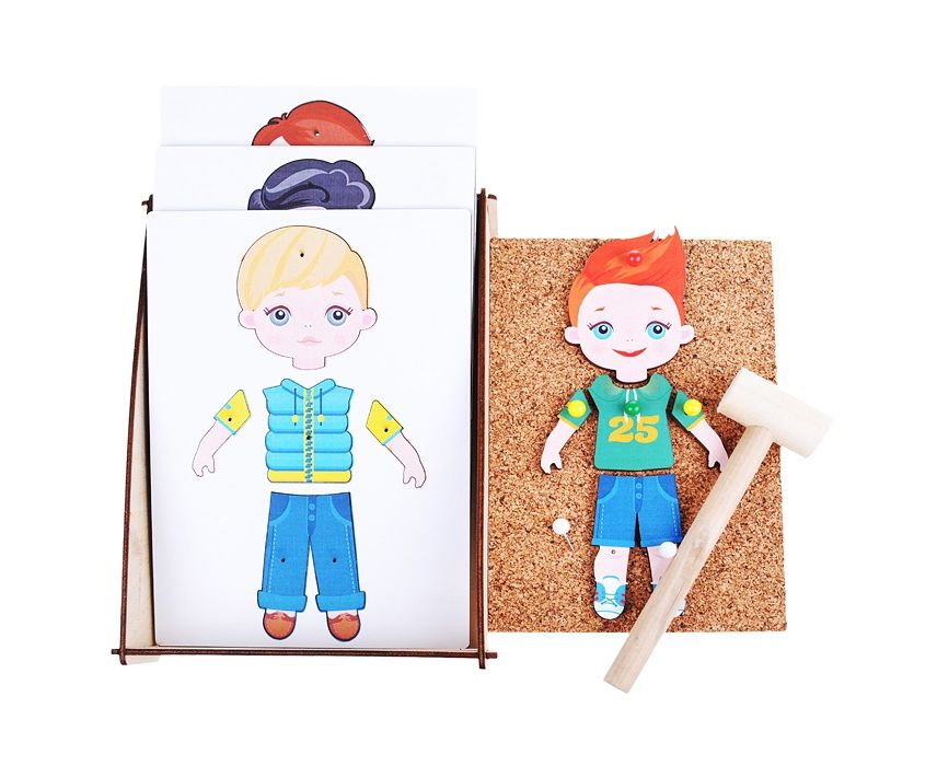 Конструктор состоит из 4-х вариантов сборной мозаики, гвоздиков, молоточка и инструкции.