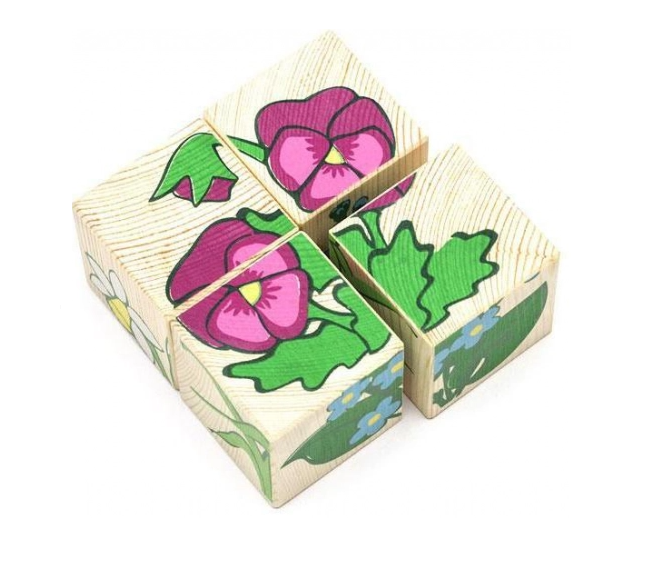 4 кубика с изображением цветов на каждой из сторон. Малышу нужно только найти соответствующие стороны и сложить картинку.