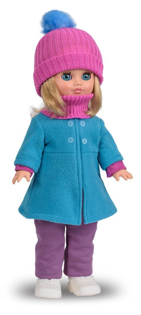 Она одета в уютное пальто, шапочку и штанишки. На ножках - ботиночки. Глаза игрушки закрываются и обрамлены пушистыми ресничками.