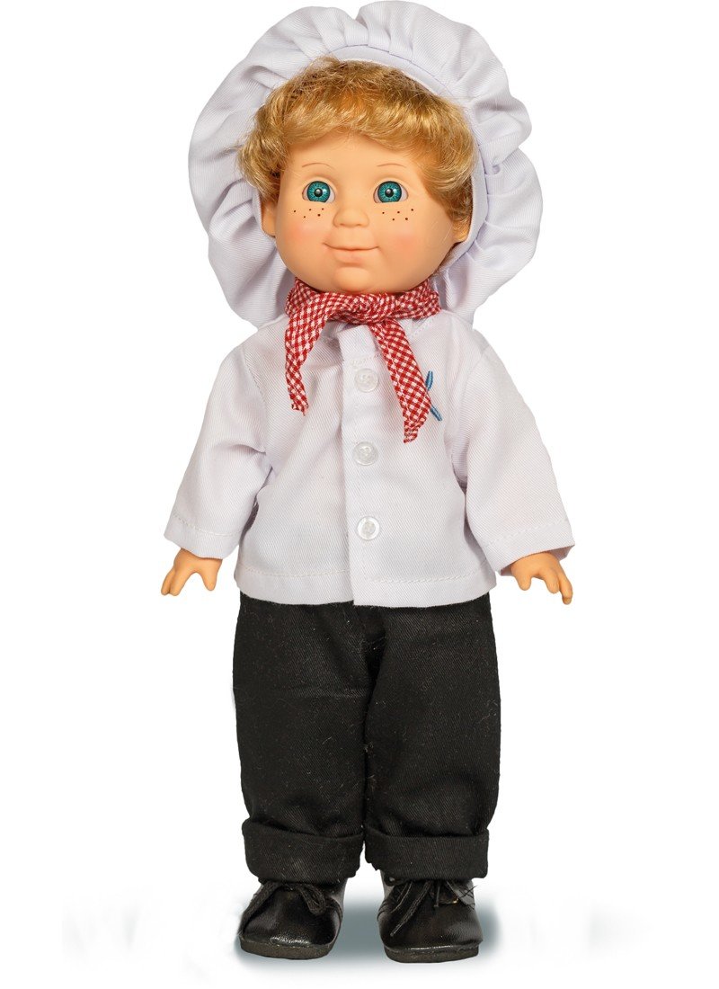 Кукла Митя Кулинар одета в белую рубашку с вышитым узором в виде вилки и ножа, синие брюки и чёрные ботинки. Завершает образ элегантно повязанный зелёный шарф и поварской колпак.