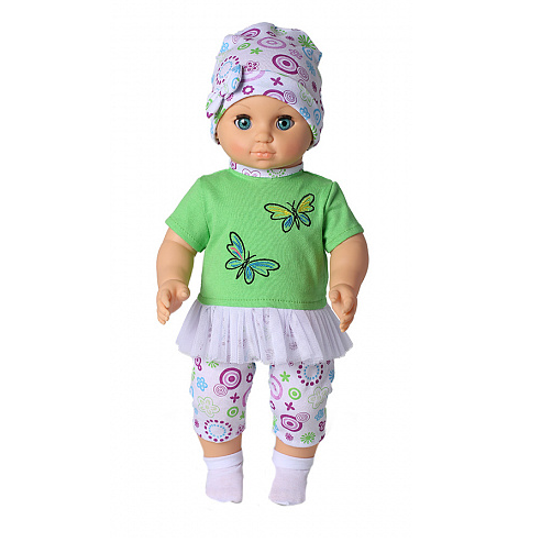 В комплект одежды входят: трикотажная однотонная туника с короткими рукавами, обтачкой горловины из цветного трикотажа, с оборкой по низу из мягкой сетки и застёжкой сзади на контактную ленту. Спереди на тунике вышивка «Бабочки». Трикотажные разноцветные бриджи длиной чуть ниже колена и шапочка с отворотом по низу и бантиком спереди сбоку на отвороте. Трикотажные носочки. Спокойное, приятное выражение лица способствует эмоциональному развитию ребёнка.