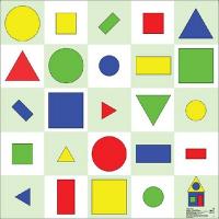 Коврик разделен на 16 квадратных сектора размером 150х150 мм, с геометрическими фигурами (квадрат, прямоугольник, круг, треугольник) 4 основных цветов (красный, зеленый, желтый, синий) и 2 размеров.